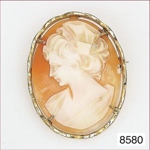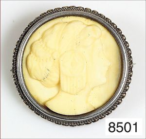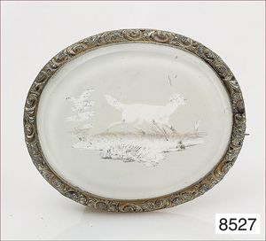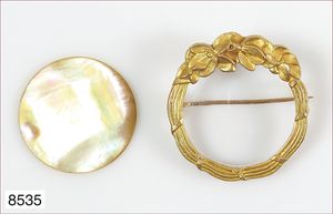 Brosche für Bild, JUGENDSTIL, Frankreich 1900/10, Silber 800/000 verg., fein gearbeiteter Rahmen mit Glas, Bild wird hinten von einer Perlmuttscheibe gehalten, D = 29 mm