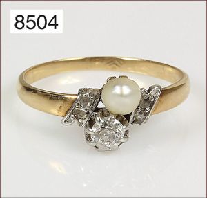 Ring, Frankreich Anfang 20.Jhd., GG/WG 750/000, 1 Altschliff-Diamant, ca.0,18 ct weiß mit Einschlüssen, 4 kl.Diamantrosen, 1 Naturperle, RW ca. 52