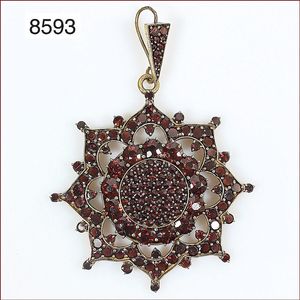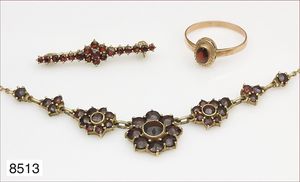 Lot: Granatschmuck, Ring, GG 333/000, RW ca. 58,5, Nadel, Metall vergoldet, L 37,5 mm, Collier, GG 333/000 gest., 43,0 cm