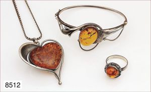 Lot Bernsteinschmuck: Armreif Silber 925/000, Innen 63,5 x 51 mm, Anhänger Silber 925/000, Kette, Silber 835/000, 88 cm, Ring Silber 925/000, RW 60