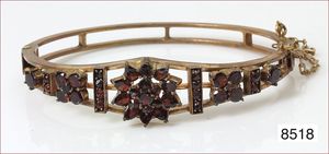 Armreif, 2.te Hälfte 20.Jhd., Metall vergoldet, Granate in unterschiedlichen Schlifformen, Kastenschloß mit Sicherheitskettchen, ausgefallene Arbeit, Innenmaß ca. 55,0 x 47,5 mm