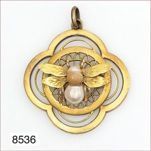 Anhänger, JUGENDSTIL um 1910, GG 585/000, filigran gearbeitet, Fliege mit 2 barocken Perlen, D = 28 mm