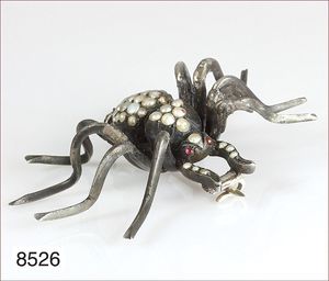 Brosche, SPINNE, Ende 19.Jhd., Flußperlen, 2 rote Cabochons als Auge, Sicherheitskettchen (Sicherheitsnadel fehlt), ca. 39 x 53 mm