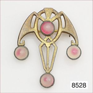 Brosche, JUGENDSTIL Replik, England, ART & CRAFT, Metall vergoldet, 4 Glascabochons, 31,5 x 38 mm