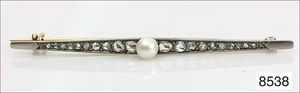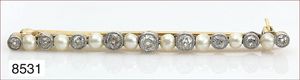 Nadel, 20er Jahre, GG 750/00, 9 Altschliffdiamanten weiß, ca. 0,55 ct weiß,zeittypisch, 8 Flußperlen, L = 52,5 mm