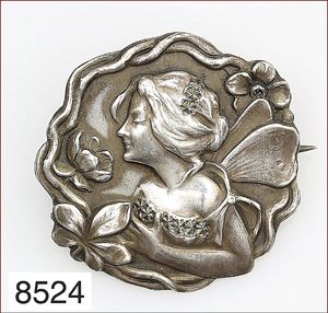 Brosche, JUGENDSTIL, Fa. Karst Pforzheim, Silber 800/000 verg., 2 Glassteine, schöne plastische Darstellung, ca. 60 x 53 mm