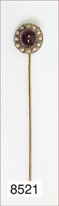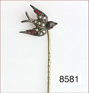 Nadel, um 1900 "Vogel", AG- teilvergoldet, 1/2 Perlen und rote Cabochons (2 Besatzsteine fehlen)