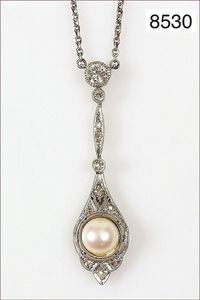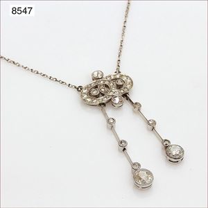 Collier sog. "Neglige-Anhänger" um 1905/10, JUGENDSTIL, deutsch, Platin, 2 Altschliff-Diamanten an zwei Messerdrahtstegen, zus. ca. 1,0 ct.,weiß-si/p, 36 Diamantrosen, Kastenschloß mit Sicherheitsacht, L = 42 cm