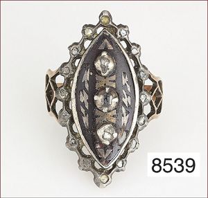 Ring um 1780/1800 wohl Südfrankreich, RG 585/000, Silber, 19 Diamantrosen (1 fehlt), Emaille/Niello ?