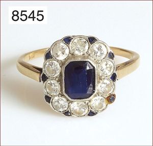 Ring um 1920, GG/WG 585/000, Saphir ca. 0,6 ct, 10 Brillanten ca. 0,60 ct tw/w-vsi, 10 kl. Saphire am Außenrand, ausgefallene Fassarbeit, RW ca.53,5