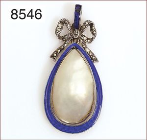 Anhänger, JUGENDSTIL, Frankreich um 1890/1910, Silber, 1 Tropfen-Mabeperle, Makasiten (1 Stein fehlt), bl. Emaile, H = 42 mm