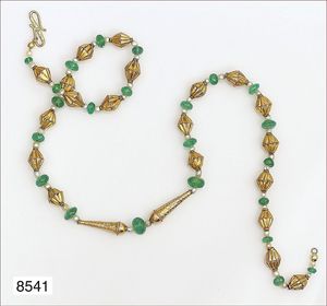 Kette, antike Indische Goldteile (vor 1900), GG 750/000 u. 900/000, 23 facettierte Smaragde mit intensiver Farbe, D = 5,3-10,5 mm, 26 Orient-Perlen, Schließe neuzeitlich, L = 62,5 cm