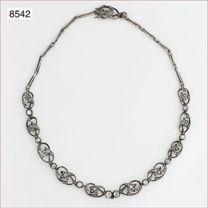 Collier, JUGENDSTIL um 1905/10, deutsch, Silber, GG 750/000, 17 Altschliff-Diamanten, ca. 2,3 ct und 121 Diamant-Rosen, ca.1,2 ct, weiß/get.weiß mit Einschlüßen (Zeittypisch), die beiden Zentralen Steine haben ca. 0,55 ct, Fassungselemente in Silber mit 750/000 Gold verbödet, Kastenschloß mit Sicherheitsacht, L = ca. 39,5 cm