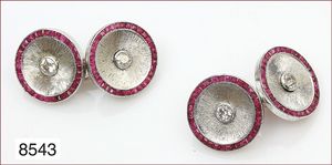 Manschettenknöpfe, feinstes ART-DECO um 1910/20, Frankreich, WG 750/000, 4 Altschliff-Diamanten, ca.0,5 ct.weiß, ca.140 Rubin-Carrees in feiner Farbe umlaufend eingefaßt, D = 14 mm, Cartier hätte es nicht besser machen können !!