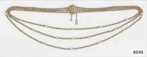3-reihiges Collier, Frankreich um 1900, GG 750/000, 17 Naturperlen in der Kette, 1 Altschliff-Diamant in der Schließe umrandet von 22 1/2 Perlen
