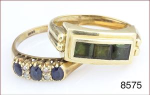 Lot: 2 Ringe, GG 585/000, Ring mit 3 Saphire und 4 Diamantrosen, RW ca. 53 und Ring mit 3 grünen Steinen, RW ca. 55
