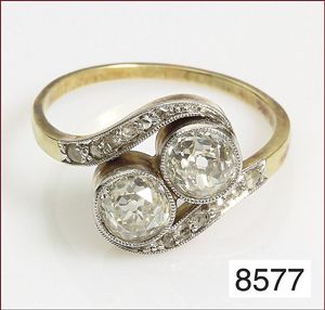 Ring, GG 585/000, PT ?, zwei Altschliff Diamanten, ca. 0,90 ct, ca. get. weiß, 12 Diamantrosen, RW ca. 53,5