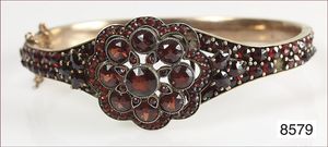 Granatarmreif um 1880, Silber vergoldet, Granate, sehr feine Arbeit, Kastenschloß, 3 Steine fehlen (können problemlos ersetzt werden), Kettchen defekt, Reif leicht unrund, 60,5 x 49 mm (Innen)