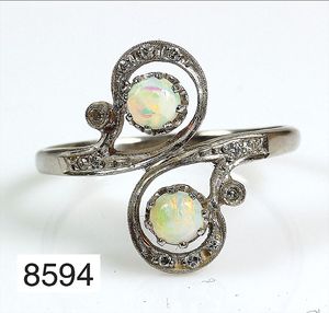 Ring, JUGENDSTIL um 1900, Platin 950/000, 2 Opale mit schönem Farbspiel, 12 Diamanten, RW ca. 60,5