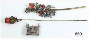 Lot: 50/60iger Jahre, 1 x kl. tibetanisches 900/000 silber Reliquar (seitlich zum Öffnen) 26,6 x 27,0 mm (ohne Kette), 1 x Hutnadel Metall mit Koralle, L. ca. 17,0 cm, 1 x Nadel, Metall, blaue Einlage und geschliffenes Glas,