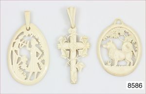 Lot: 2 Anhänger, Bein, Hund (ohne Schlaufe) & Armor, 50,0 & 65,0 mm hoch, Kreuz mit fein ausgearbeiteten Efeuranken (Elfenbein), um 1900