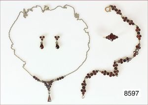 Lot: Granatschmuck, 1 x GG 333/000 Stecker mit Granat-Tropfen H = 15 mm ; 1 x Ring GG 333/000,Granate, RW ca. 55; Armband Ag 925/000 vergoldet, Granate, L = 19,7 cm; Collier, Ag verg., Granate, L = 42,5 cm