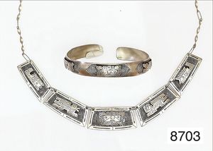 Lot: Silber-Spange 800/000 mit bolivianischen Motiven, Silber-Collier 800/000, mit bolivianischen Motiven, Knebelschließe, Länge ca. 46 cm
