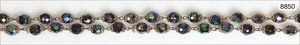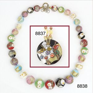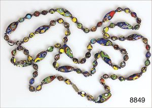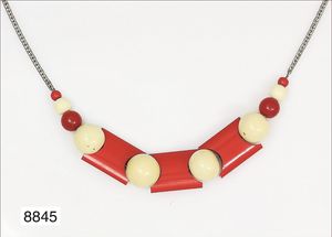 Kette, ART DECO, Metall, Kunstoff, gelbe Kugeln, schwarze Zylinder u. Kugeln, Mittelteil bläulich mit Metalleinlagen, ca 43,0 cm, auf Metallkette gefädelt