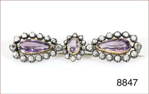 Lot: 20er Jahre, Nadel: Metall, Glas (Opalglas mit weißem Kranz),ca. 39 mm, Brosche: Metall vergoldet, Glas, lila Cab. mit roten Korallimitat, ca. 39 x 30 mm