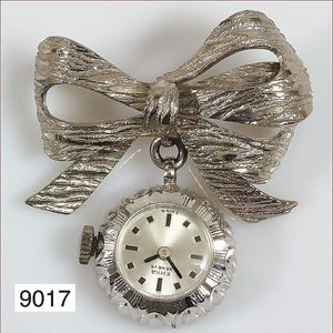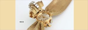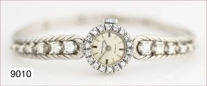 Damenarmbanduhr, SIVANA, Frankreich frühe 50er Jahre, Handaufzug, Uhr verborgen hinter aufklappbarem Deckel, mit 11 Brillanten besetzt, ca.1,05 ct, w-si/vsi, Kastenschloß mit Sicherheitsacht, L = 19,0 cm, total 56,1 g, Uhrglas fehlt, Uhr läuft