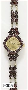 Damenarmbanduhr, Handaufzug, Metall vergoldet, mit Kastenschloß, Granate, ca. 18,5 cm, Uhr läuft