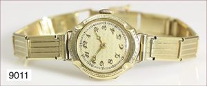 Damenarmband-Uhr, 20er Jahre, GG 585/000, Handaufzug, Goldarmband mit Kastenschloß und zwei Sicherheits-Achter (1 Feder im Band fehlt), L = 18 cm, total ca.20,3 g