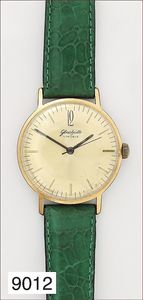 Herrenarmbanduhr, GLASHÜTTE Original, Gehäuse 20 Mik. vergoldet, Boden Stahl, goldfarbenes Zifferblatt mit Strichindex und Zentralsekunde, schwarze Zeiger, Kaliber 70.1, Stoßsicherung, D = 36,0 mm, Uhr läuft