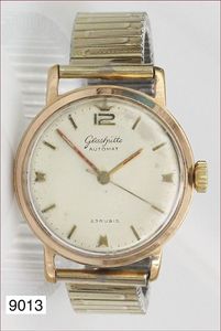 Herrenarmbanduhr, GLASHÜTTE Original, Gehäuse 20 Mik. vergoldet, Boden Stahl, Stahlarmband verg., cremefarbenes Zifferblatt mit Zahl / Strichindex und Zentralsekunde, (an Zeigern Teilabplatzung der roten Farbe), Automatik Kaliber 68.1, Stoßsicherung, D = 33,2 mm, Glas muss fixiert werden, Uhr läuft