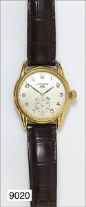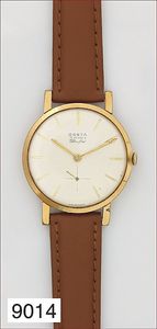 Herrenarmbanduhr, DESTA Ultraflat, Swiss Made, Gehäuse u. Boden 10 Mik. vergoldet, cremefarbenes Zifferblatt mit Strichindex, kl. Sekunde, Kaliber P.330, D = 34,0 mm, Uhr läuft