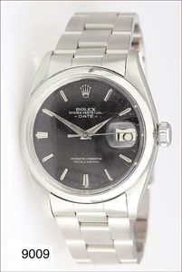 Herrenarmbanduhr, ROLEX Oyster Perpedual -Date-, Stahl mit Edelstahl Band u. Faltschließe, Automatik, verschraubter Boden, verschraubte Krone, schwarzes Zifferblatt mit Strichindex, Datum unter Lupenglas, Kunstoffglas, D = 35 mm, Uhr läuft, muß aber überholt werden