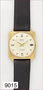 Herrenarmbanduhr, THOL, 70er Jahre, Gehäuse vergoldet, Zifferblatt mit Strichindex, Zentralsekunde, Kaliber PUW 460, ca. 30,0 x 30 mm, ungetragen mit Originaletikett, Uhr läuft