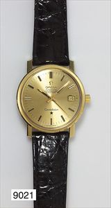 Herrenarmbanduhr, OMEGA um 1968, Strichindex, Zentralsekunde, Datumsanzeige auf 3 Uhr, goldene Zeiger, Handaufzug, Edelstahlgehäuse mit Goldkappe, Boden verschraubt mit goldener STERNWARTENPLAKETTE, rotverg.Automatikwerk Kal.564, Schwanenhalsfeinreg, Lederband mit Dornschließe, D = 35, Uhr läuft