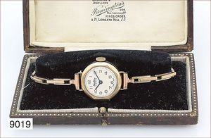 Damenarmbanduhr um 1920, BENTIMA, Rose-Gold, 375/000, Handaufzug, Zugband, Kastenschloß mit Achter und Sicherheitskettchen, Originalschatulle, L = 15,5 cm, Uhr läuft