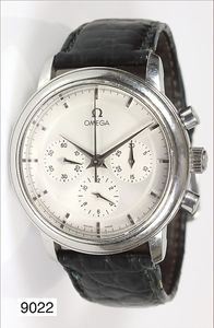 Herrenarmbanduhr, OMEGA Chronograph aus den 90er Jahren., Strichindex, Handaufzug, Gehäuse Edelstahl, Boden gedrückt, Kal. 861, Saphirglas, Lederband mit Dornschließe, D = 40 mm, (Nullsteller stellt nicht auf Null), Uhr läuft