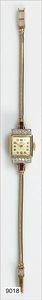 Damenarmband-Uhr, ART-DECO um 1930, Handaufzug, GG 375/000, 24 Diamanten, ca 0,25 ct weiß, 4 Rubin-Carrees, L = 16,5 cm, Uhr läuft