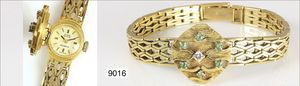 Damenarmband-Uhr als Schmuckband zu Tragen, 50iger Jahre, EMKA GENEVE, GG 750/00, 1 Brillant, ca. 0,11 ct, weiß,.6 grüne Steine, Handaufzug, L = 17,5 mm, Uhr läuft