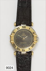 Damenarmbanduhr, OMEGA Constellation aus den 80-90er Jahren., Punktindex, Quarzwerk, Gold - Edelstahl, röm.Zahlen auf der Lünette, Boden gedrückt, original Lederband mit Dornschließe, D = 22,7 mm, neue Batterie, Uhr läuft