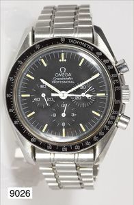 Herrenarmbanduhr um 1971, OMEGA, Chronograph, SPEEDMASTER PROFESSIONAL "First Watch Worn On The Moon", schwarzes Tritium-Ziffernblatt mit Strichindex, Lünette mit Tachymeterskala, Kunstoffglas, Edelstahlgehäuse, verschraubter Boden, Edelstahlband mit Faltschließe, Boden mit Seepferdchen Logo, Handaufzug, Werk rotverg., Kal. 861, D = 42 mm, Uhr läuft