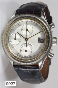 Herrenarmbanduhr wohl 80er Jahre, HAMILTON, Chronograph, Zifferblatt mit Strichindex, Datum unter Lupenglas, Mineralglas, Edelstahlgehäuse, verschraubter Boden, Kal. ETA 28/92 Lederand, D = 36,5 mm, Uhr läuft nicht
