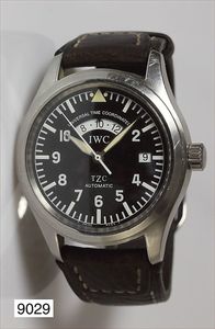 Herrenarmbanduhr 1998, IWC, " Die FLIEGERUHR UTC", schwarzes Ziffernblatt mit arab. Zahlen und Strichindex. Zeiger, Zentralsek., 24 Std. Anzeige ( 2.Zeitzone), Saphirglas, Edelstahl Gehäuse, verschraubter Boden, verschr. Krone, Automatik, Kal. ETA 2892, original Lederband mit Dornschließe, D = 39 mm, Uhr läuft, Originalpapiere vom 28.7.98