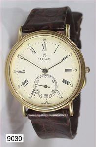 Herrenarmbanduhr, MILUS aus den 90er Jahren, champagnerfarbenes Zifferblatt, röm. Zahlen, kl. Sekunde auf 6 Uhr, goldplattiertes Gehäuse mit gedrücktem Stahlboden, Quarzwerk, Lederband mit Dornschließe, D = 33 mm, neue Batterie, Uhr läuft,