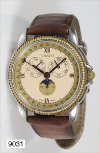 Herrenarmbanduhr, TISSOT 90er Jahre, Vollkalender incl. Mondphase, Gehäuse Edelstahl, ged. Boden, Lünette vergol., Saphirflachglas,Lederband mit Faltschließe, D = 35,5 mm, Uhr läuft nicht