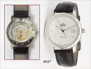 Herrenarmbanduhr, UNION-GLASHÜTTE, Mod. Nr 1743, cremefarbenes Zifferblatt, Zentralsekunde, Strichindex, Datumsfenster, Automatik, Manufaktur Kal. 26, Edelstahlgehäuse, Saphirglas, verschraubter Boden, hinten Glasboden, original Lederband, D = 37 mm, Uhr läuft, Kaufpapiere Dez. 2008, Revision Okt. 2011,sehr guter Zustand