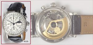 Herrenarmbanduhr um 2000, CHRONOSWISS, Model: LUNAR, Chronograph, guill. Zifferblatt in Sterlingsilber, arab. Zahlen, gebl. Zeiger, Anzeige von Std.,Min.,kl. Sek., Datum, Mondphase u. Chronographenzeiger, beidseitig Saphirglas, Edelstahlgehäuse, verschraubter Boden, Kal. C. 755, original Lederband mit Dornschließe, Automatik, Kal. C. 755, D = 37,5 mm, (seitlich kl. Abplatzer am Glasboden), Uhr läuft